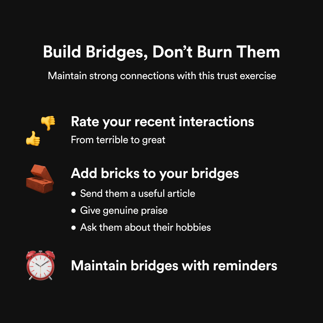List 10 people you work with frequently and rate the last interactions you had with them from terrible to great. Each interaction is a single bridge.