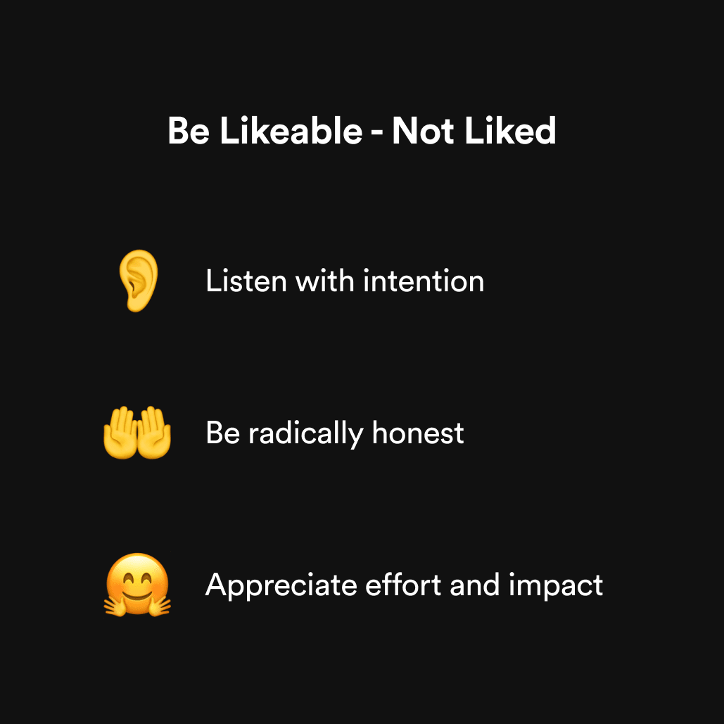 A healthier balance is to be likeable - not liked, by showing your team they are listened to, treated fairly, and valued.