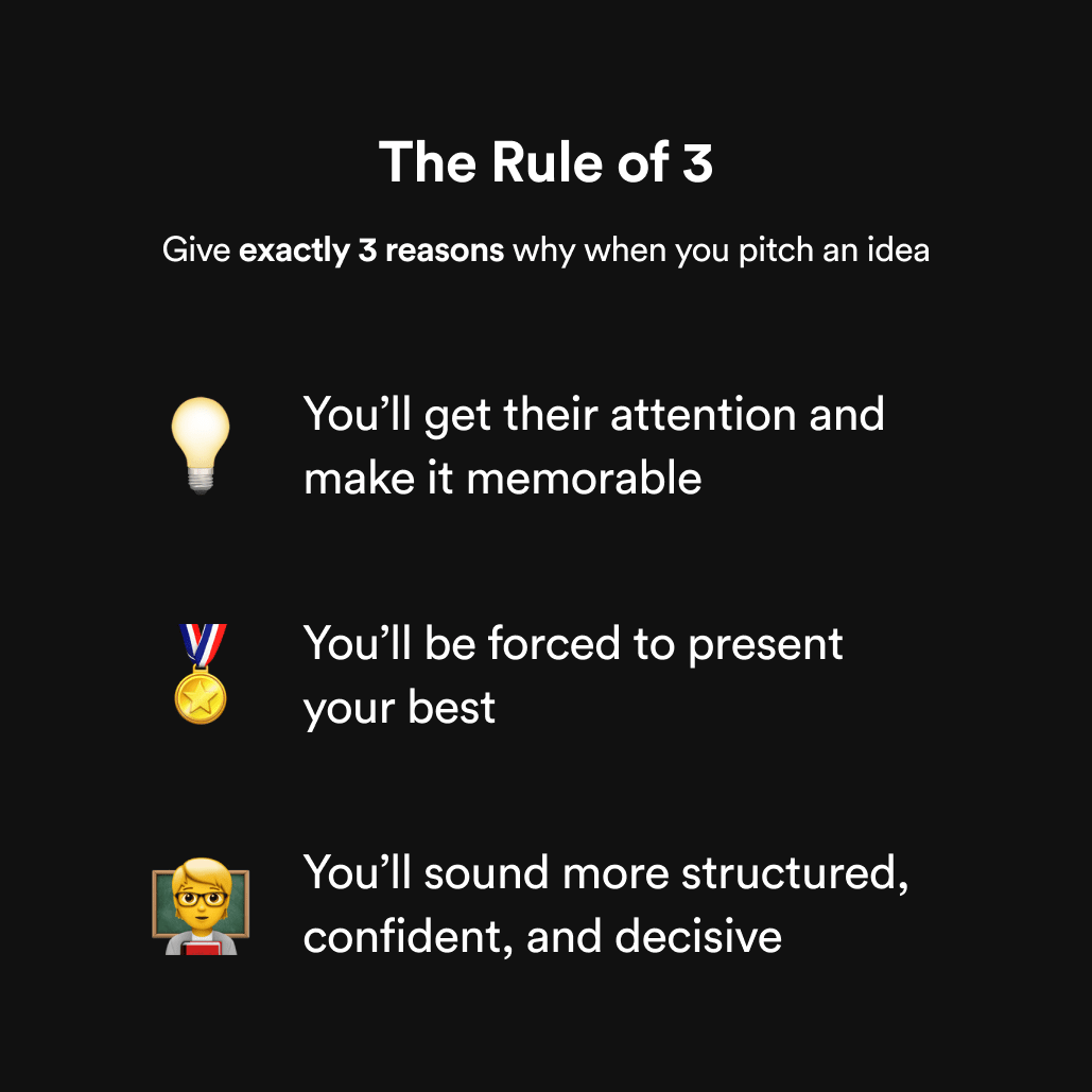 Next time you’re pitching an idea, try out the Rule of 3 for Persuasion from McKinsey. It’s simple, but powerful: present exactly 3 reasons when you share your angle.