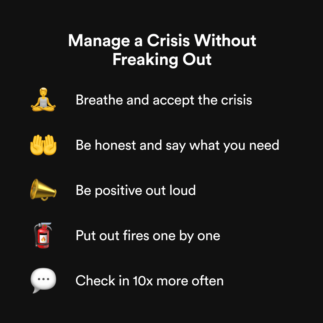 It can be very stressful to lead your team through a crisis - but keep breathing, work on supporting your team, and focus on your goal.